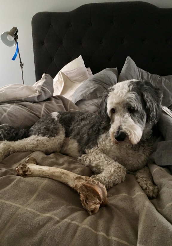 Me: Beaumont! Is that a moose leg bone in the bed?