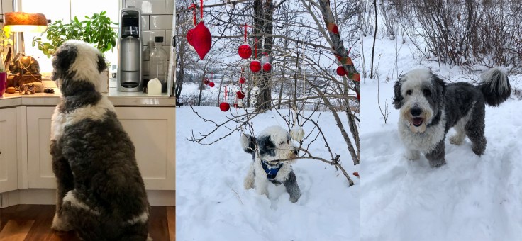 And so… the turkey came out of the oven. We parcelled it up and made our deliveries (and pick-ups too as my sister and daughter had made the veggies and potatoes to go with the turkey and our friends U and A offered up Mushroom Soup and herring from their Polish Wigilia of the night before). At each stop, we made sure to keep our distance while Beau (wearing his jingle bell collar) jumped out of the car and raced to the door barking and spinning in circles and making a fuss – his own special way of saying, “I Love You! Merry Christmas!” (probably also in the hopes of getting treats too – which works btw. Every time.)